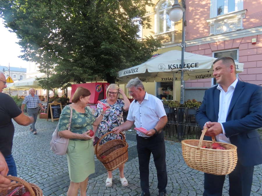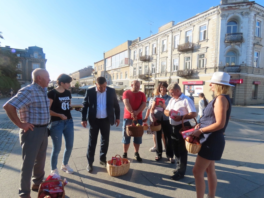 Z  tej  okazji dzisiaj  przeprowadziliśmy uliczną    akcję , mającą  na  celu  popularyzowanie  jabłek, jako najzdrowszego  owocu  świata, którego 45%  produkcji    w Polsce  pochodzi z  naszego  regionu .  Była to  dobra okazja  do  spotkań  z  mieszkańcami  i do  rozdawania  ulotek  przez  kandydatki  i  kandydatów do polskiego parlamentu.